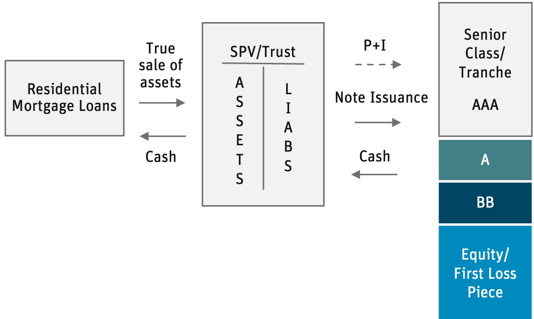 - Asset Pooling & Securitization: These loans are pooled and acquired by a special purpose vehicle/entity (SPV/SPE), which raises capital through the issuance of debt and residual interest securities, collectively known as asset-backed securities.