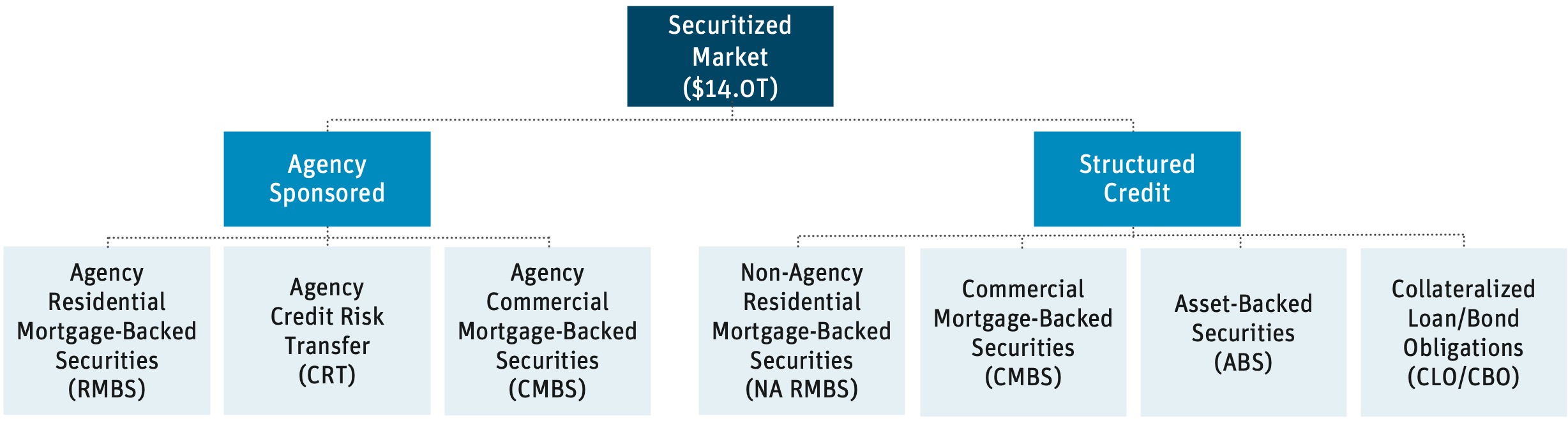 - Market Segmentation – Agency-sponsored products (e.g., Agency RMBS/CMBS, CMOs, CRTs) are fully or partially guaranteed by the government (Ginnie Mae, Fannie Mae, Freddie Mac), offering strong credit stability but exposure to prepayment and interest rate risks. Private Label/Non-Agency products (e.g., Non-Agency RMBS/CMBS, ABS, and CLOs) offer higher yield and flexibility but carry greater credit and liquidity risks due to lack of government backing.
