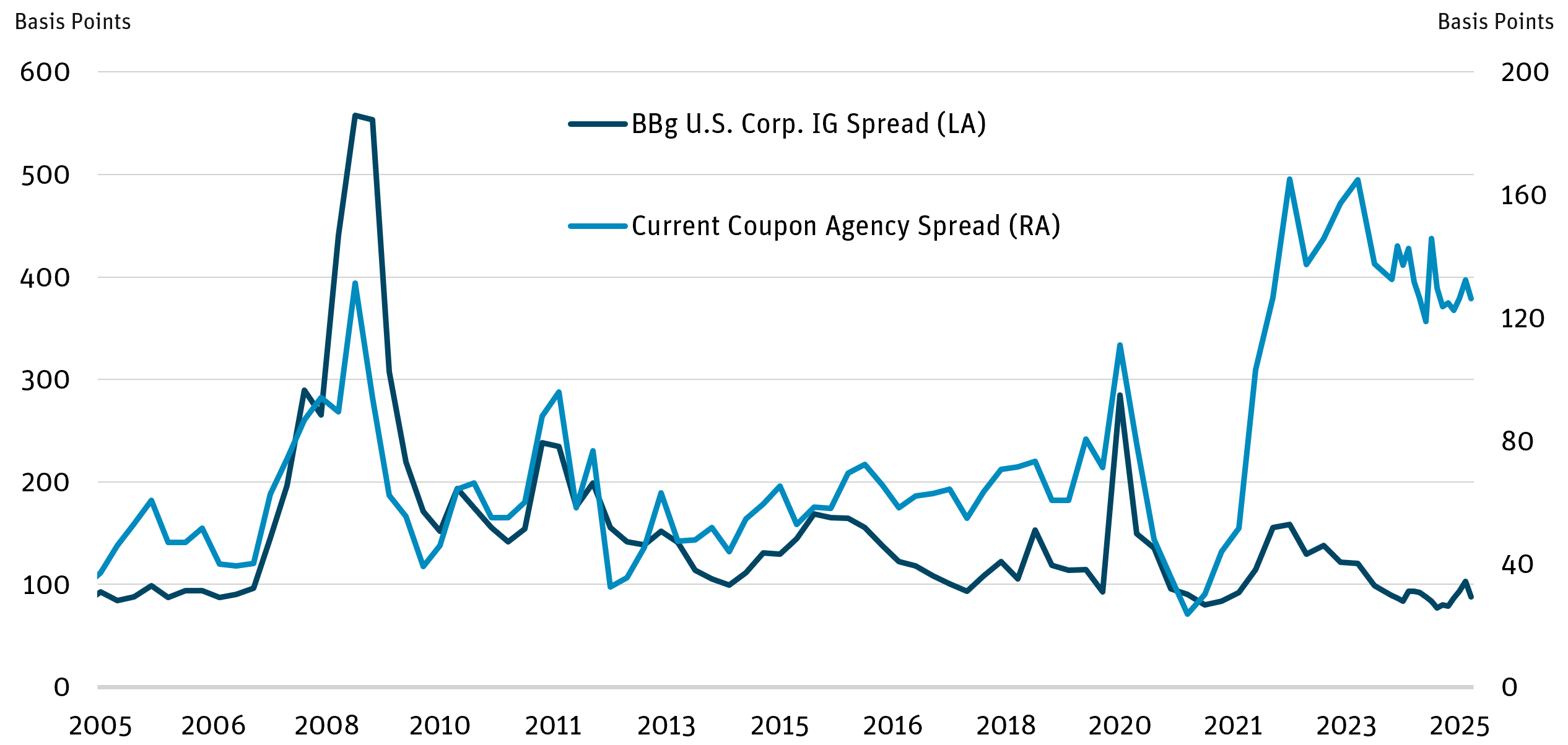 Agency mortgages are trading wider than IG corporate credit for the first time in 20 years. Agency MBS present a relative-value opportunity driven by limited bank demand and elevated interest rate volatility. We are therefore bullish on agency MBS versus Treasuries.