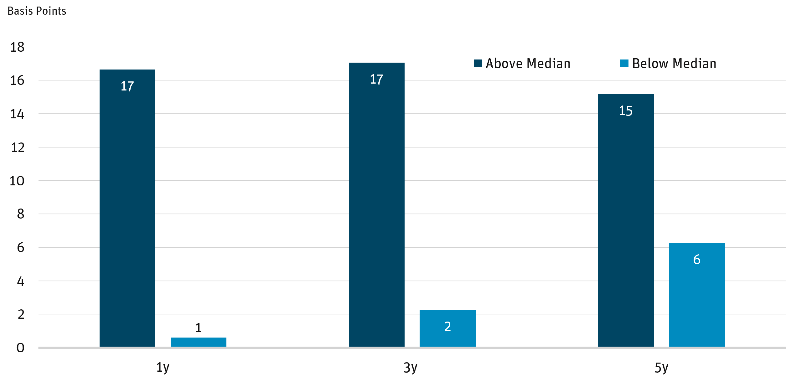 Wide credit spreads have historically led to higher future returns, and vice versa. Figure 5 shows the average monthly excess return of the Corporate Bond index over the following one, three, and five years. Excess returns6 are greater when the index spread is above the median.